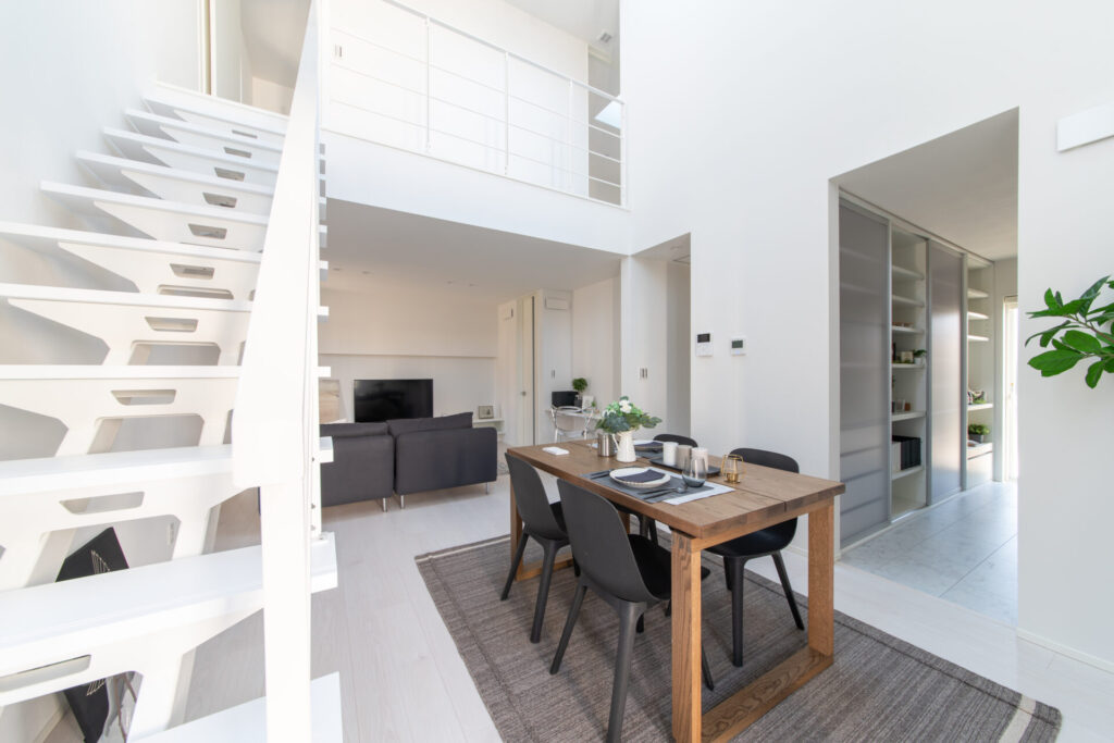 吹き抜けを通じて上下階が繋がり、家族の気配を感じられる一体感のある住まいです。