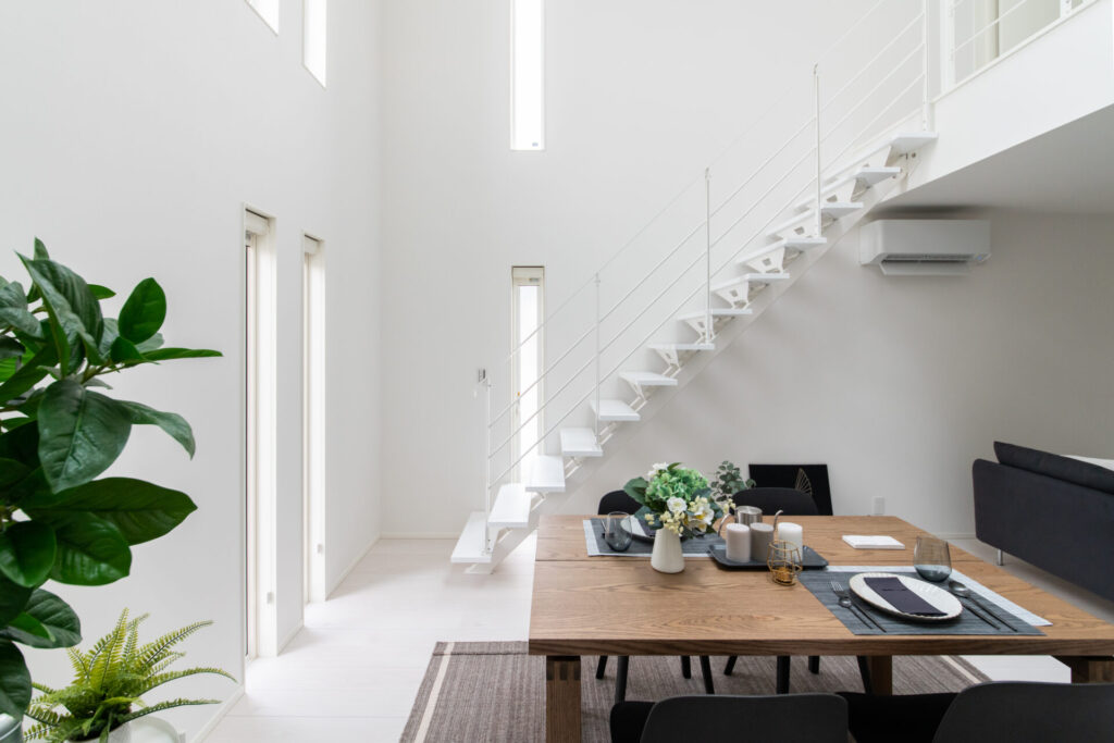 天窓からの光が白い壁に反射し、家中を優しく包み込みます。