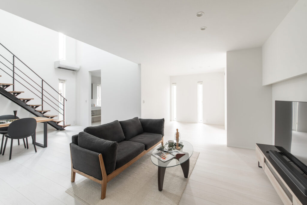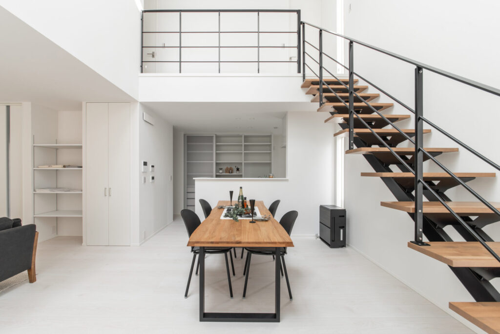 大きな吹抜けとスケルトン階段を組み合わせることで、1階と2階が緩やかに繋がり、家族の気配をどこにいても感じられる設計になっています 。光と風を計算し尽くした窓配置が、数値以上の広がりと心地よさをもたらします。