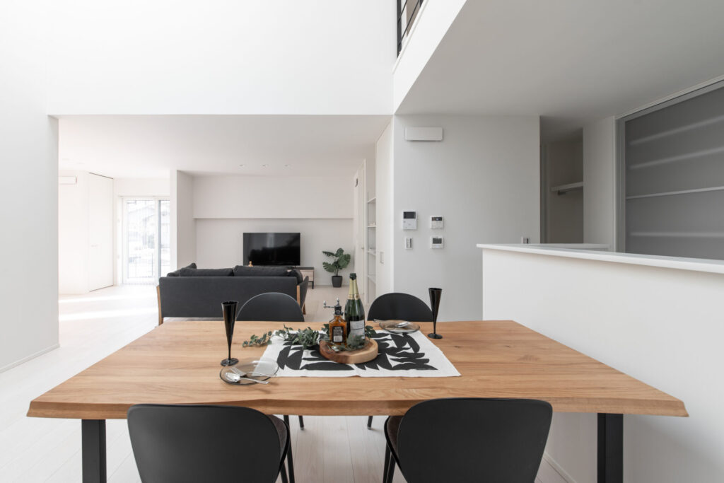 無垢のダイニングテーブルとブラックのチェア、落ち着いたトーンのソファが、白壁の空間に上質なコントラストを描き出します 。