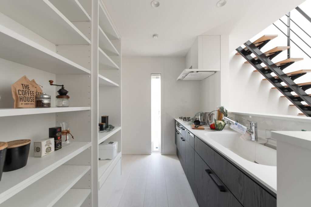 オープンな棚を活用した収納は、お気に入りの道具を飾る楽しみを与えてくれる一方で、動線は極めてスムーズ 。