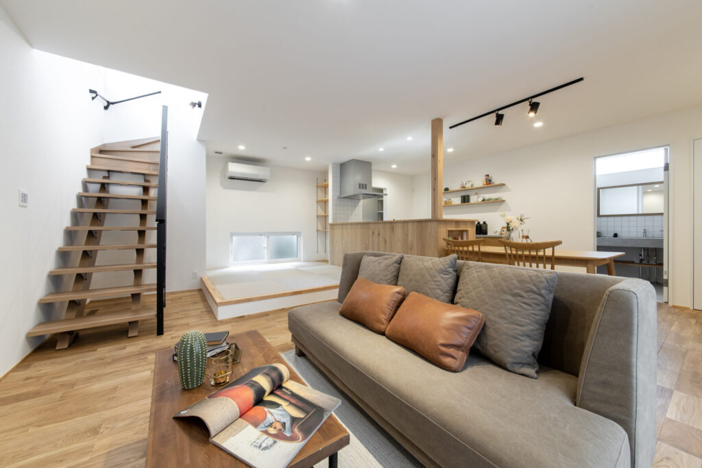 リビングの一角には、あえて段差を設けた畳スペースを配置。