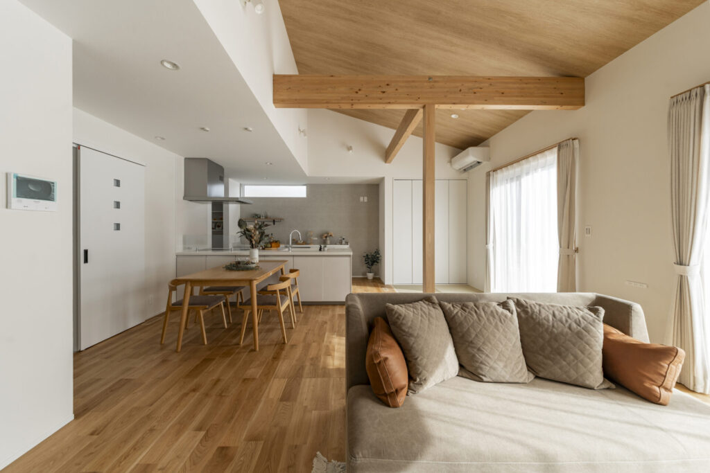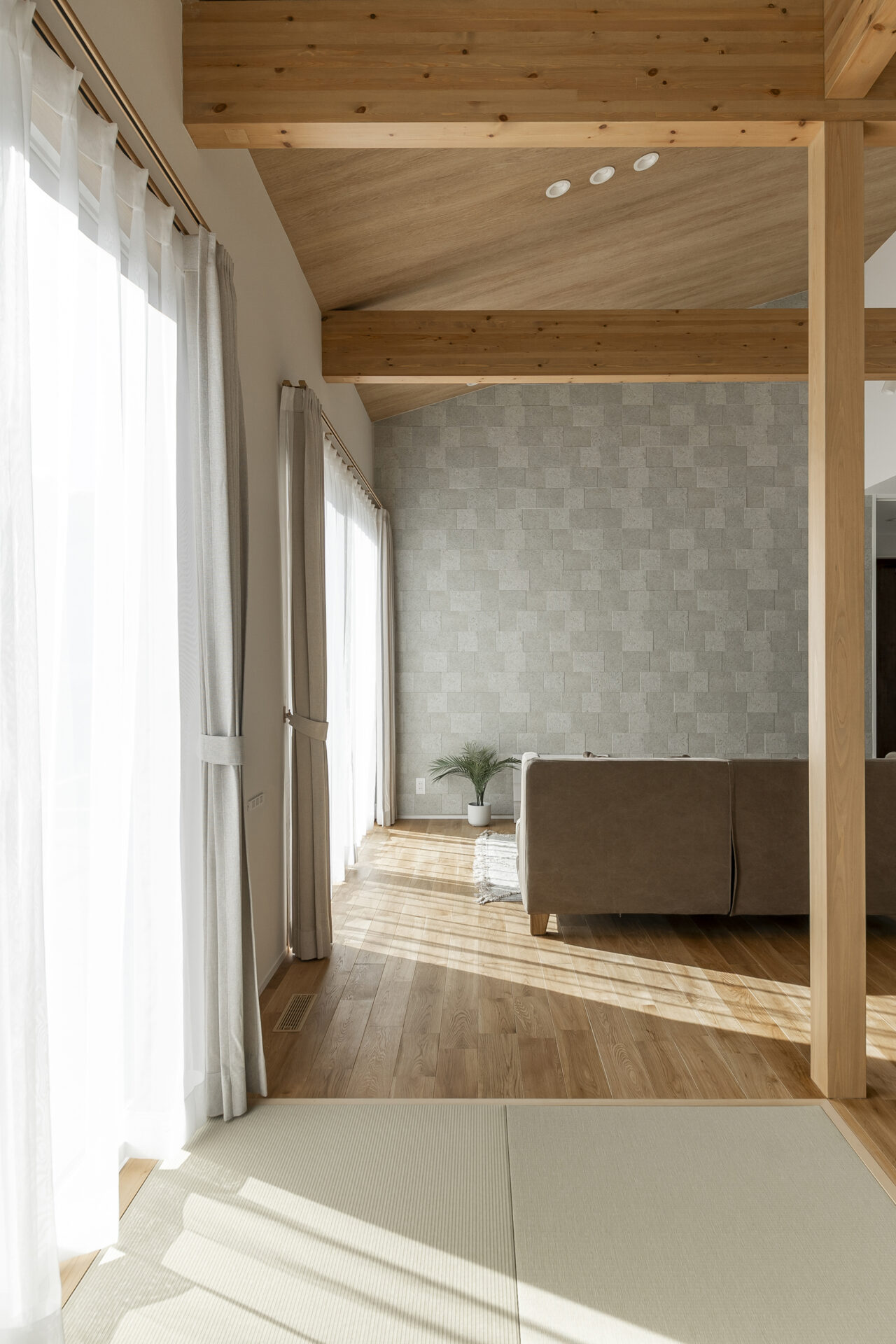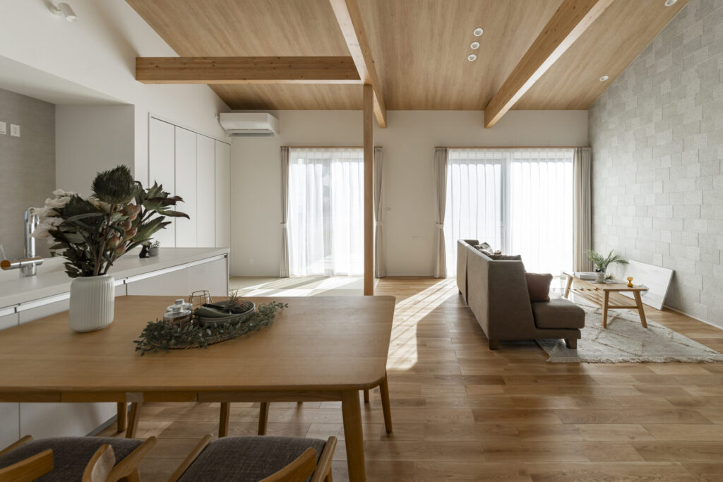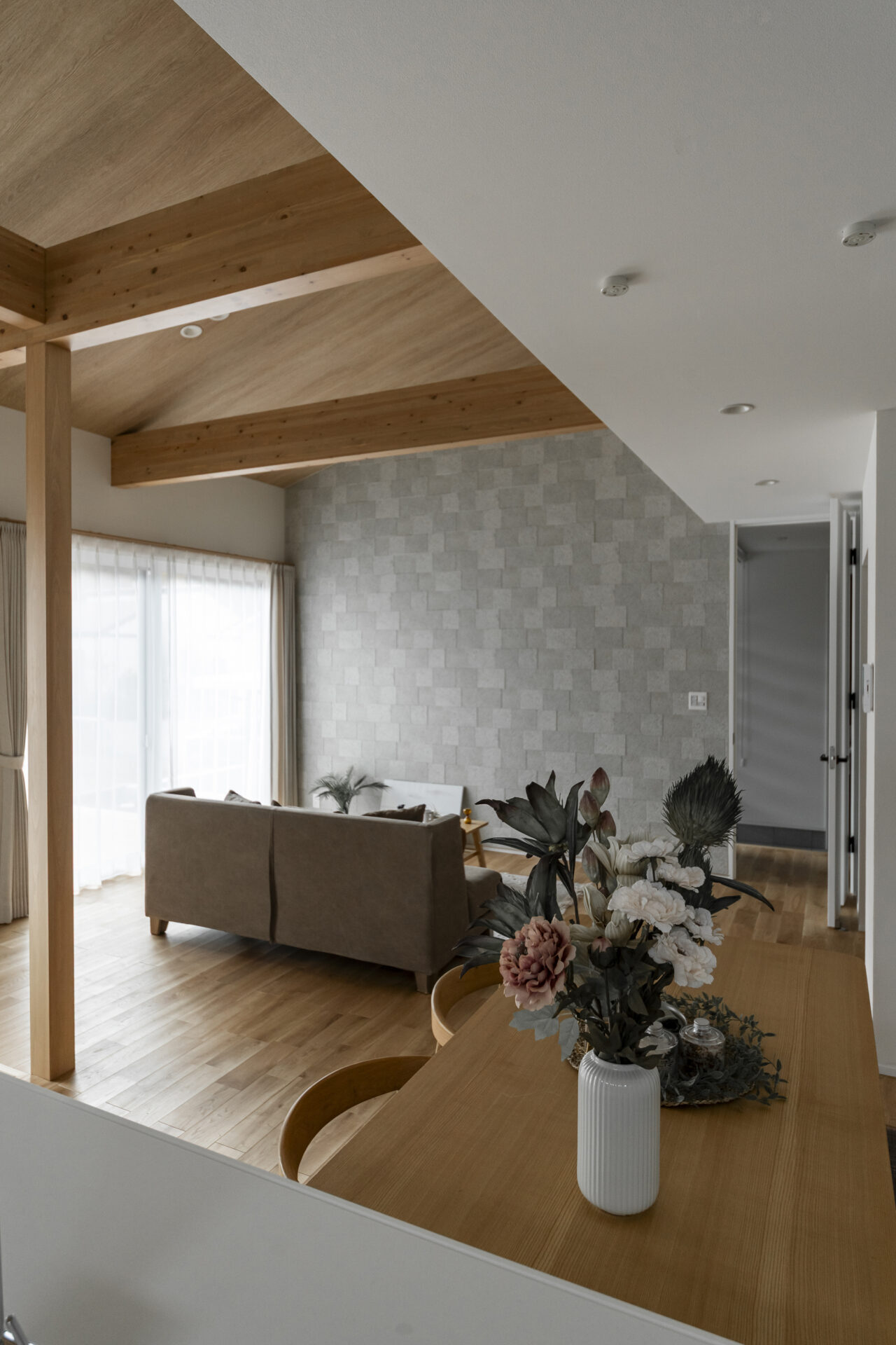木の構造あらわし、無垢フロア、塗り壁の採用で、自然を感じられるこの土地にふさわしいナチュラルな空間をコーディネートしています。