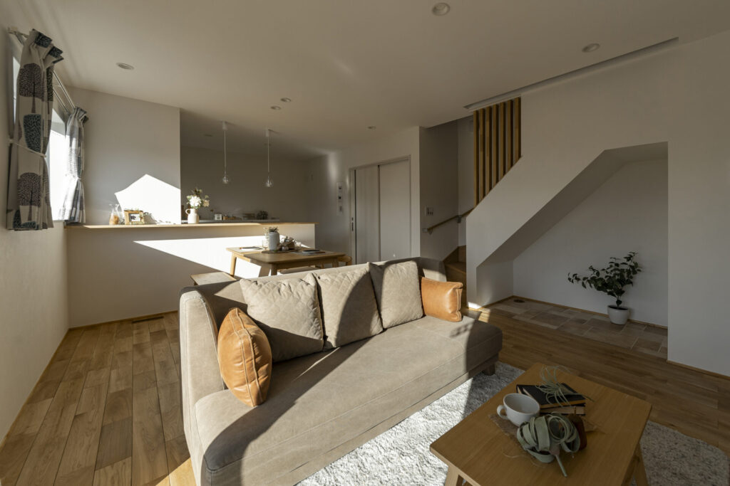 延床面積86㎡というコンパクトなサイズの中に、平屋のような機能的な動線と、吹き抜けによる開放的な空間構成を凝縮しました 。