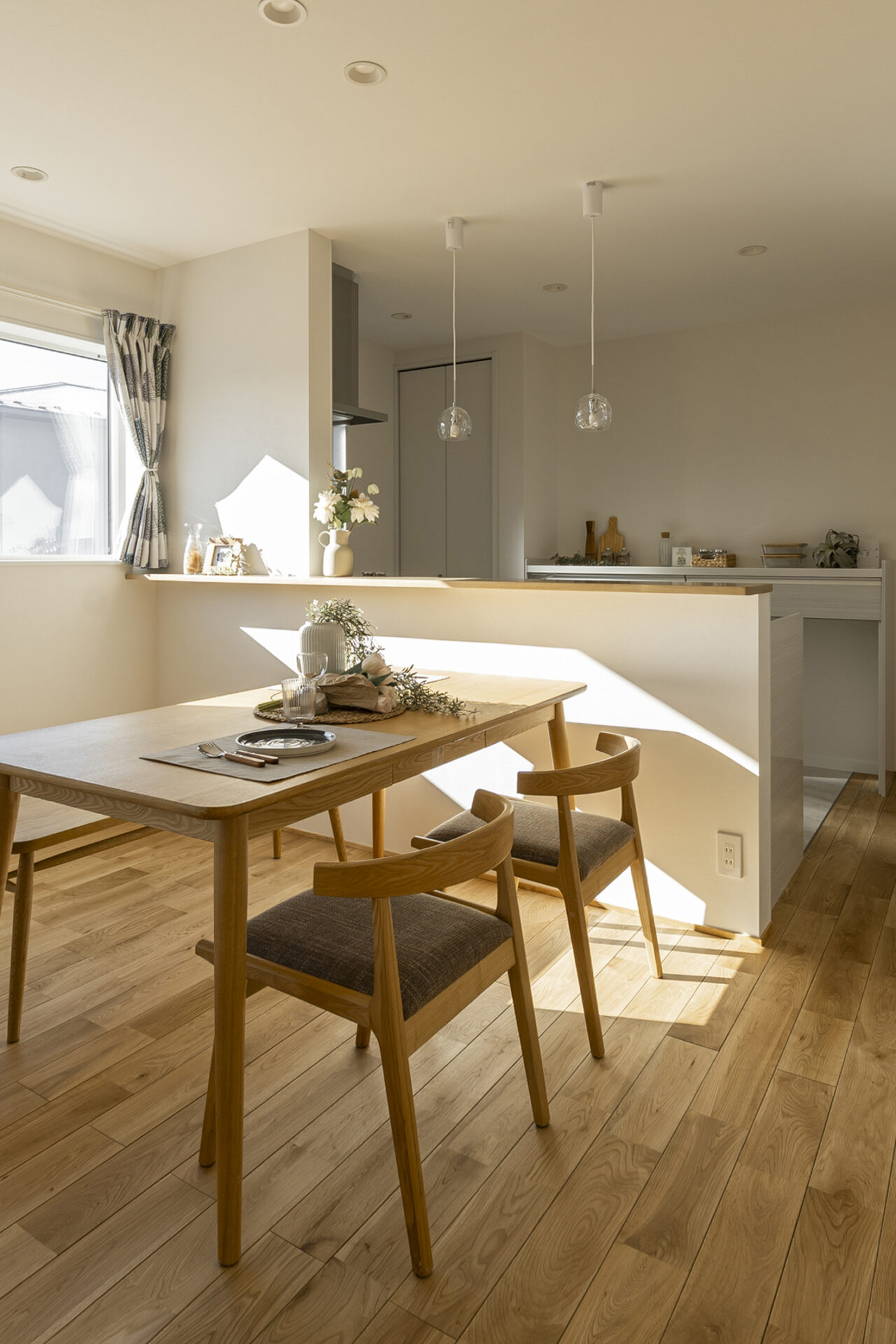 LDK: ホワイトの壁と明るい木目のフロアが光を拡散する、清潔感あふれるリビング 。