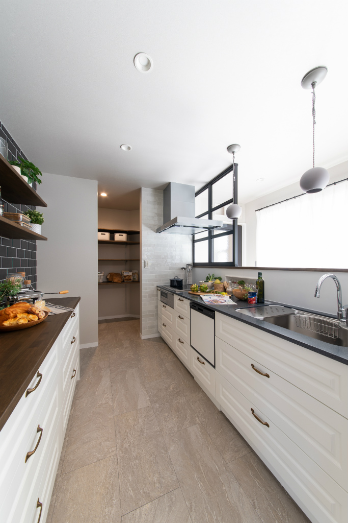 食洗機付きの大容量収納キッチン。奥には食品庫スペースも配置。玄関へと繋がります。