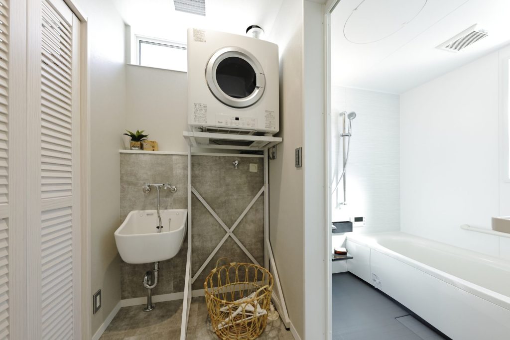 脱衣室にはガス乾燥機を標準装備。洗濯家事時間の短縮とふわふわの洗濯物に!