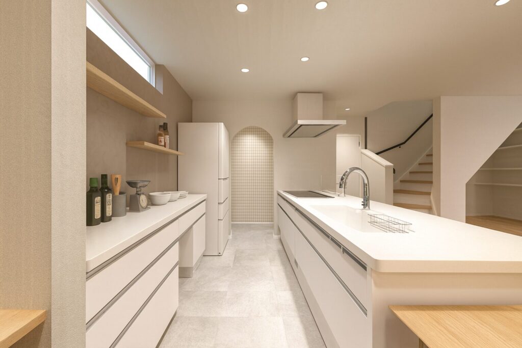 回遊しやすい動線と、使う場所のそばにまとめた収納で、家事のムダが減るキッチンです。