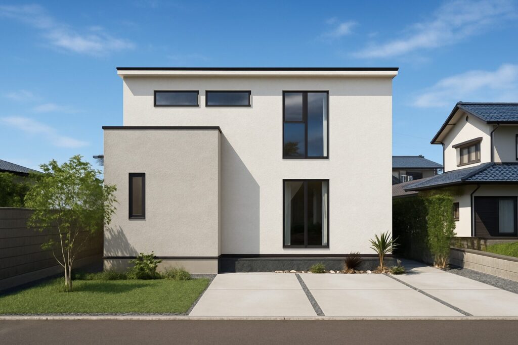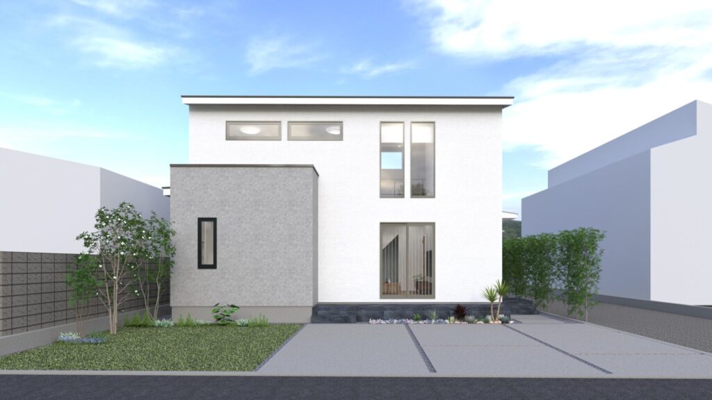 白とグレーの落ち着いた色合いに、木枠の窓がそっとやわらかさを添える北欧ナチュラルの外観。頑張りすぎていないのに、きちんと整って見えるその雰囲気が、帰るたびにふっと心を軽くしてくれます。